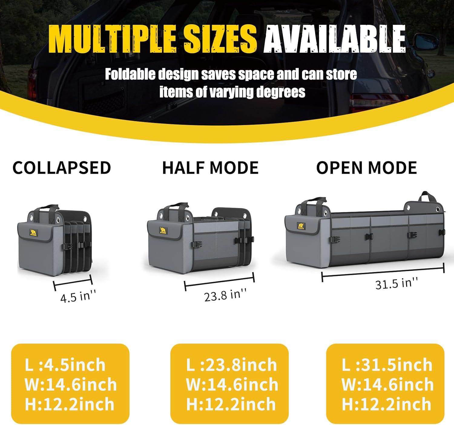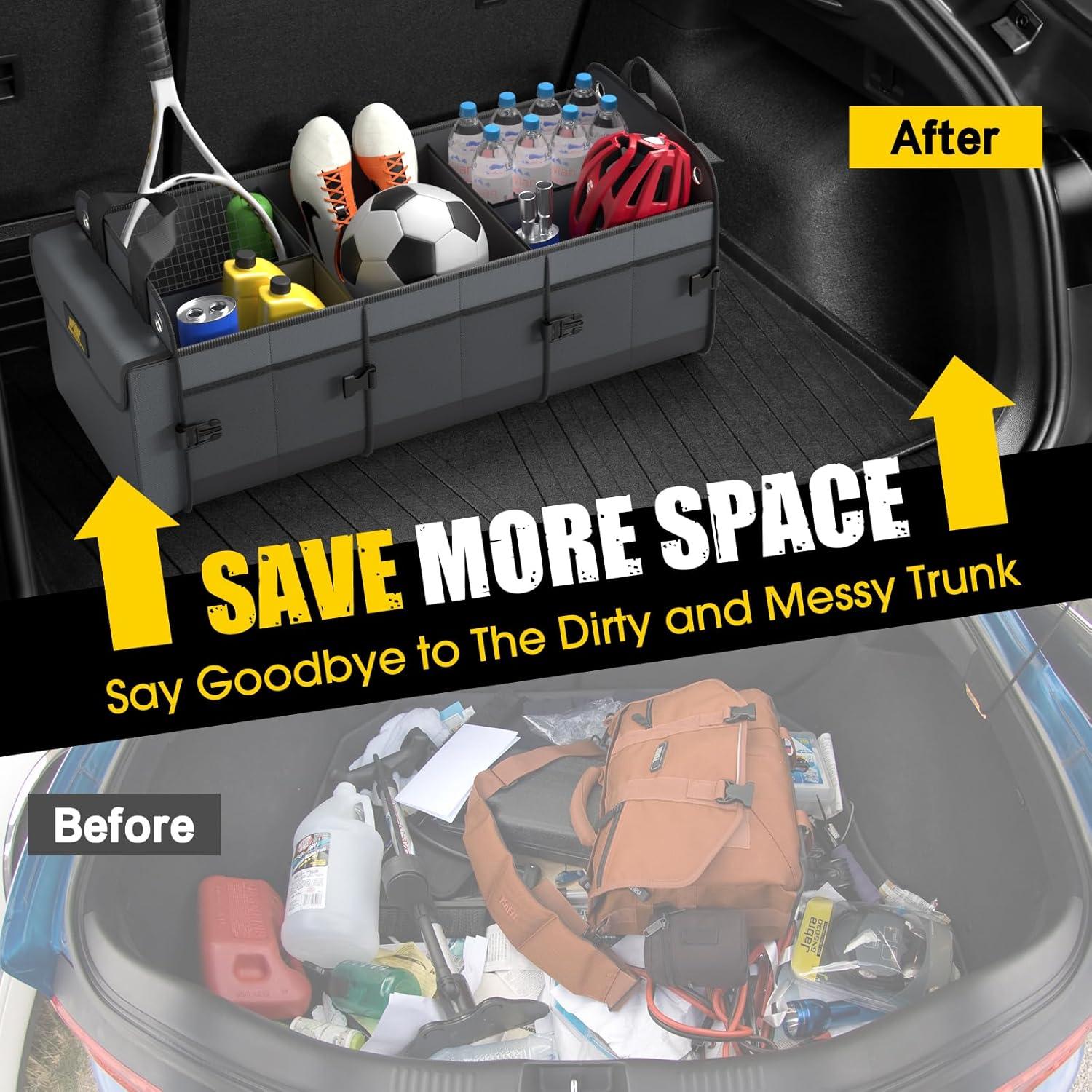 [STABLE AND COLLAPSIBLE]: With our car organizers and storage, you’ll never have to worry about groceries bouncing around in your car again. It stays rock-solid thanks to a combination of bottom Velcro and adjustable straps, keeping it stable no matter what. Plus, it’s fully collapsible—fold it up or expand it to fit your needs in different situations, or tuck it away completely when you’re not using it for easy storage