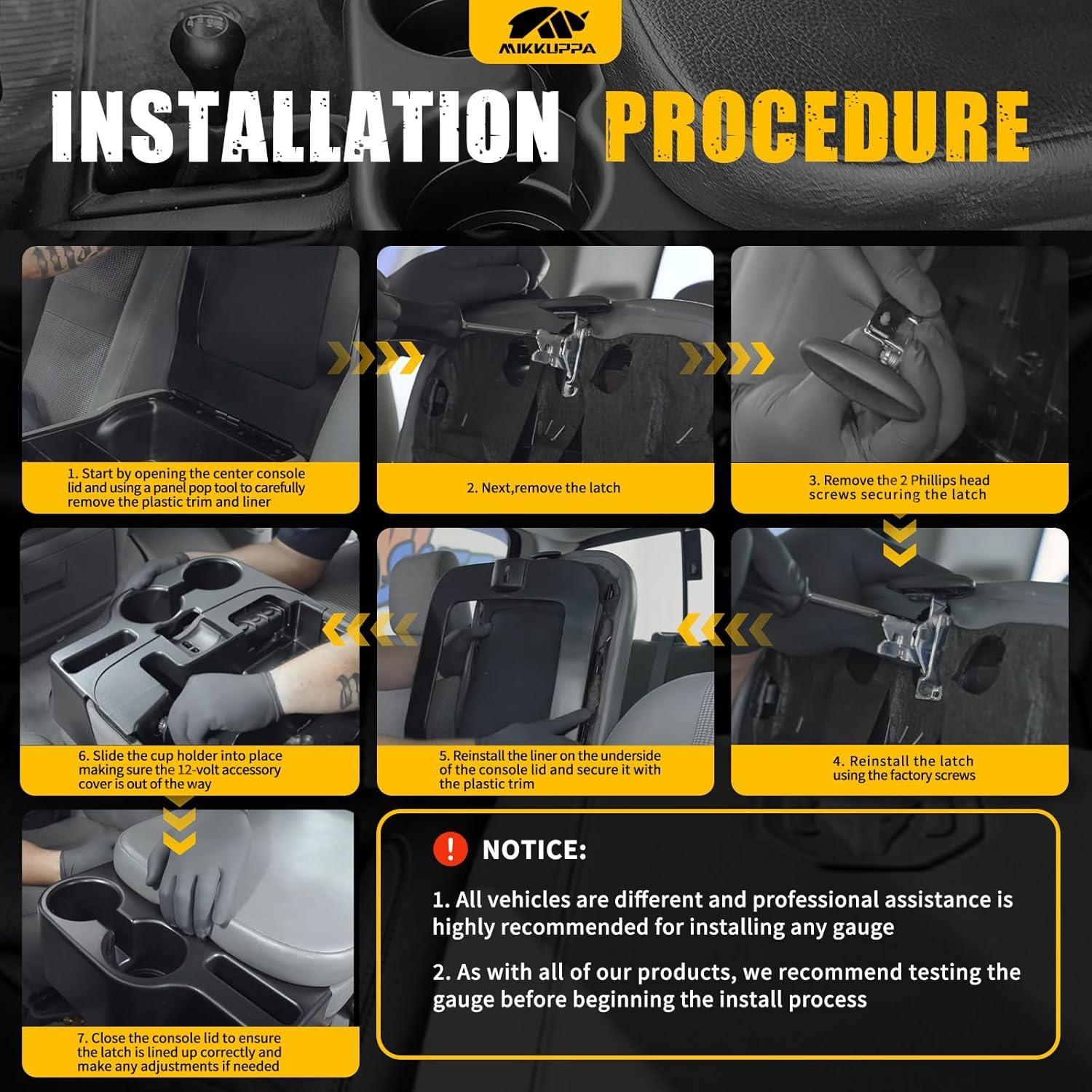[INSTALLATION STEPS]: 1.Open the center console cover and use the panel ejection tool to remove the plastic trim and padding; 2.Remove the screws securing the latch; 3.Place a spacer of about 1/4 inch on the back of the latch and reinstall the latch; 4.Reinstall the padding on the bottom of the center console cover as well as the plastic trim; 5.Fix the cup holder in place; 6.Close the center console cover and observe that the latche are properly aligned