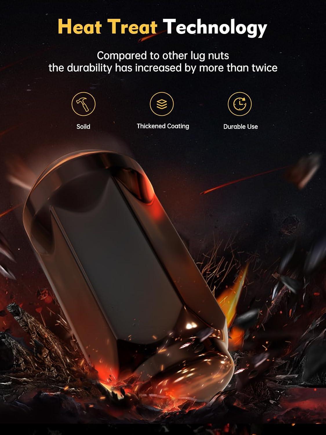 One-Piece Nuts: The one-piece structure design is more splendid and safer than the two-piece design. Thick coating, cold forged and heat treated steel soild lug nuts, anti-rusting and anti-stripped, high strength and durability