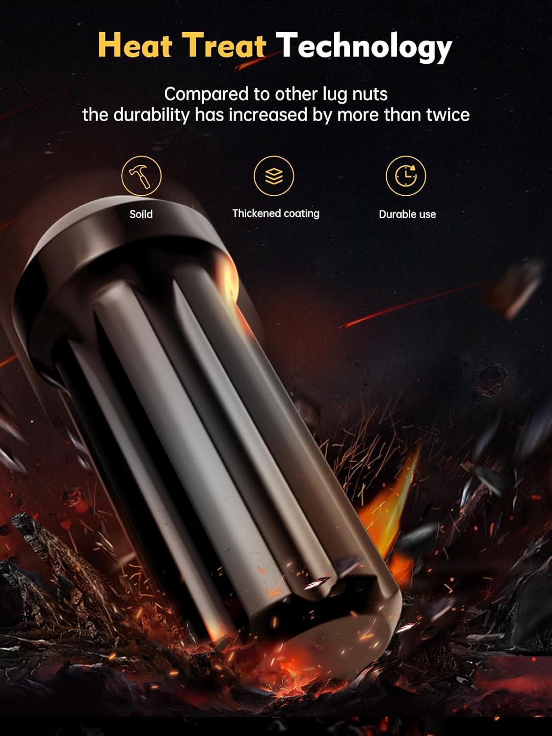 One-Piece Nuts: The one-piece structure design is more splendid and safer than the two-piece design. Thick coating, cold forged and heat treated steel soild lug nuts, anti-rusting and anti-stripped, high strength and durability