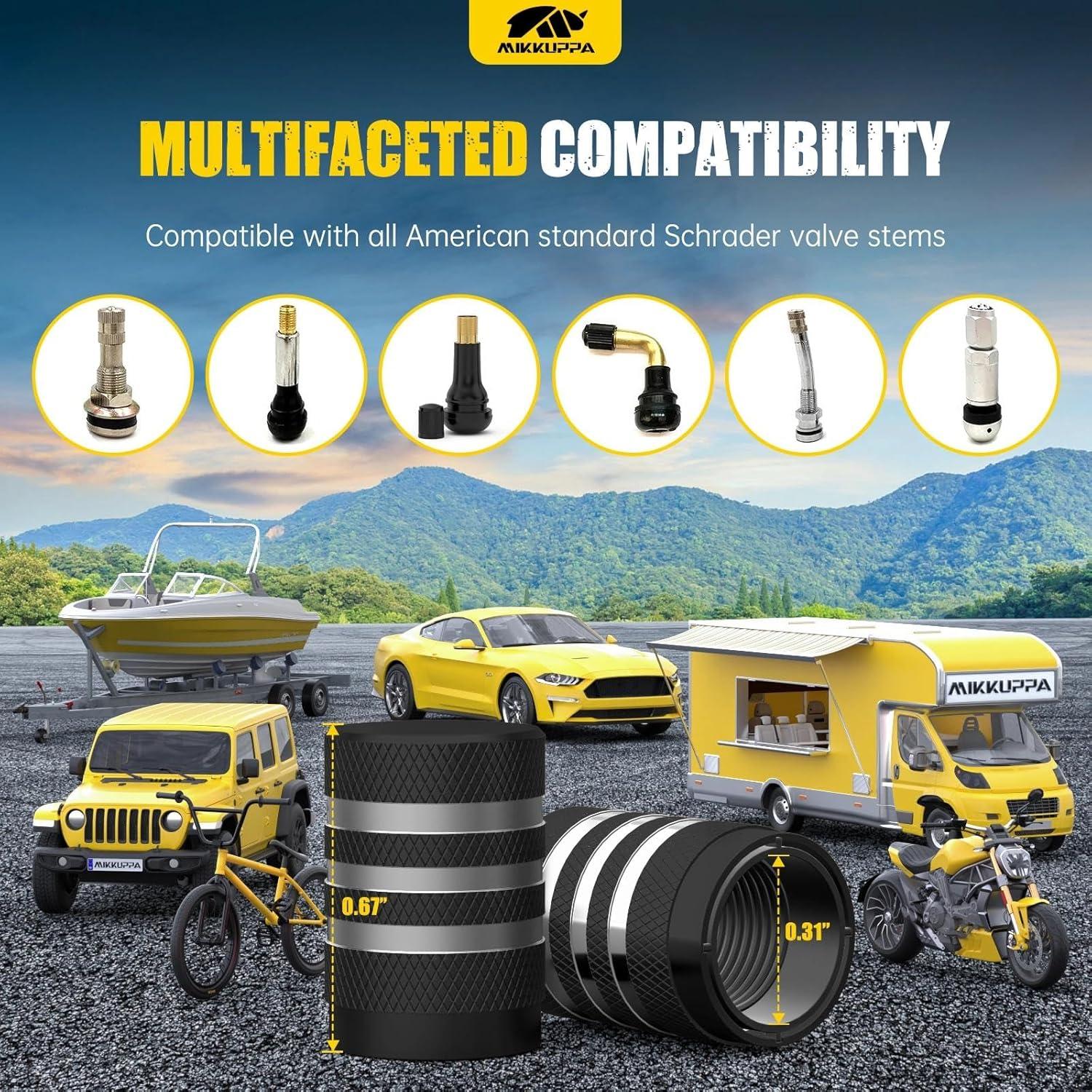 Universal Fit: Tire valve caps (0.31inch inner diameter, 0.67inch height) are compatible with all standard Schrader valve stems used in cars, SUVs, trucks, RVs, bikes, motorcycles, and other vehicles. Enjoy peace of mind with a reliable fit across a variety of tires