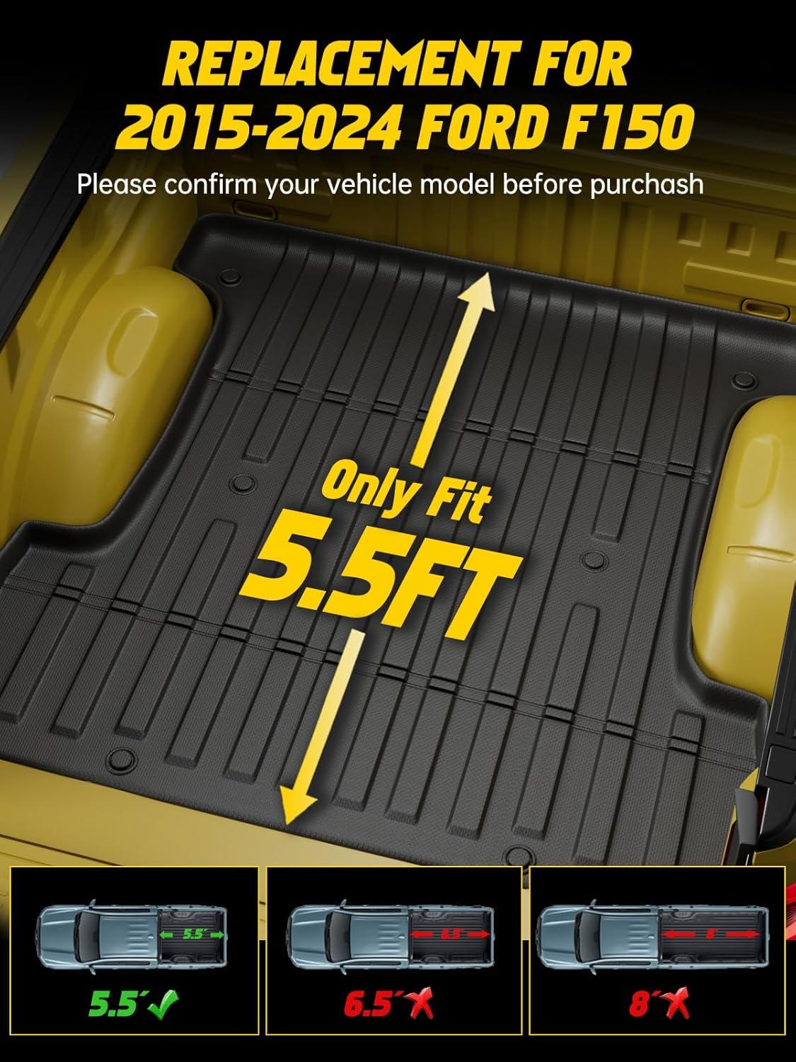 APPLICABLE VEHICLES: The truck bed mat compatible with 2015-2024 Ford F150 5.5FT. We utilize 3D laser scanning technology to acquire the most accurate data. Please be sure to confirm the year and model of your vehicle before purchasing
