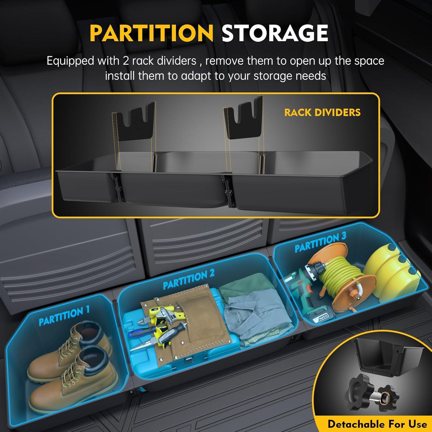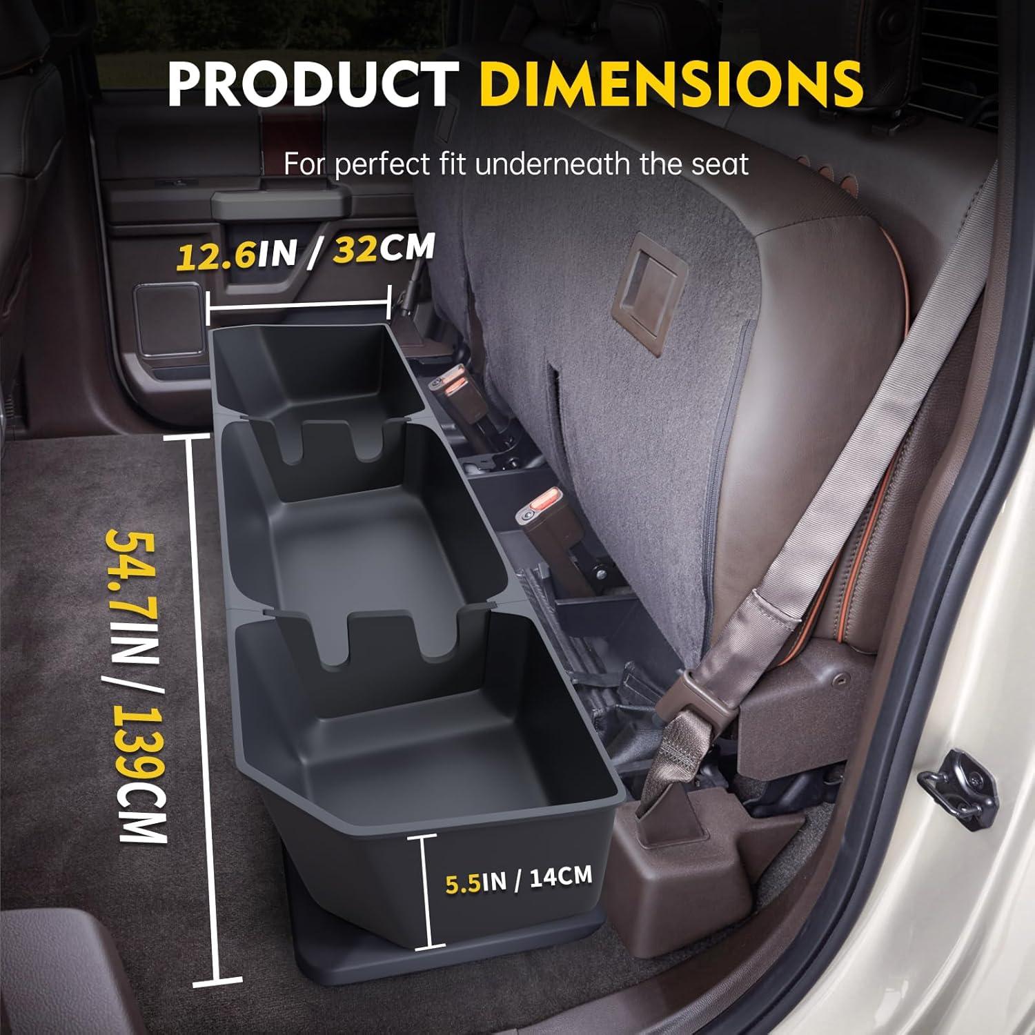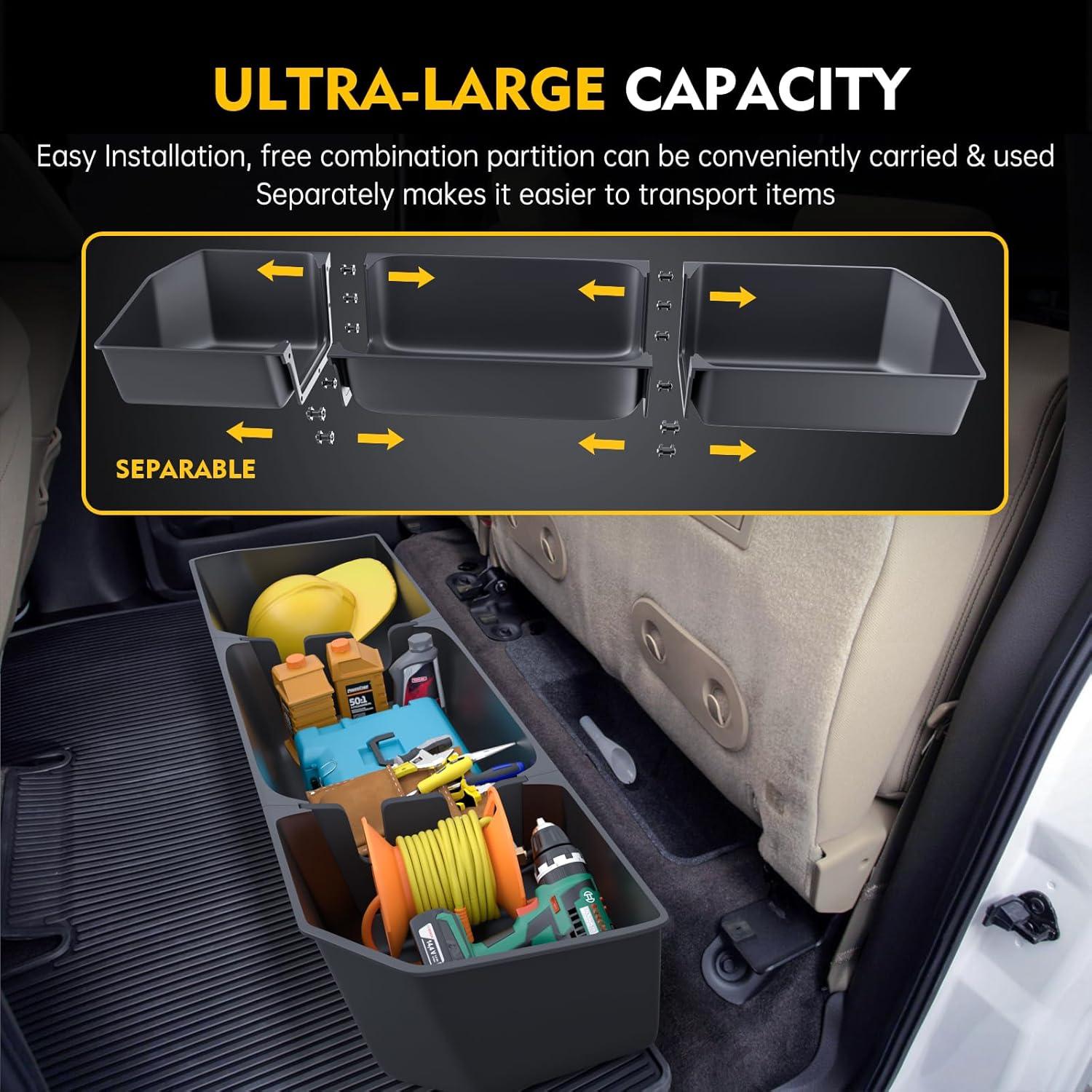 [EXTRA STORAGE SPACE]: The space under the truck's rear seat is the perfect storage spot. Our truck underseat storage organizer offers approximately 70L of storage capacity, maximizing this space without compromising legroom and the seat's full functionality—you can use it to store jumper cables, wheel tools, cleaning supplies, hunting gear, and more