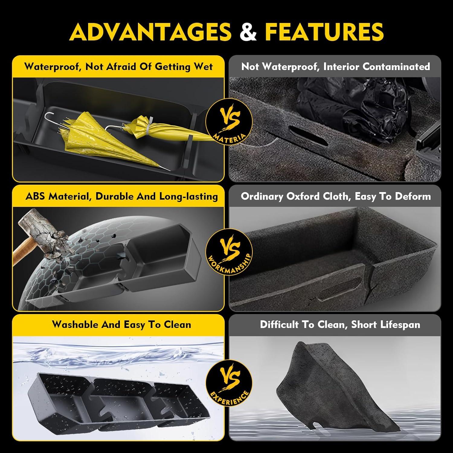 [DURABLE MATERIAL]: Our truck tool box is made of carefully selected Acrylonitrile Butadiene Styrene (ABS) material. Its matte frosted black surface blends perfectly with your car's interior, and it's waterproof, fade-resistant, and easy to clean. It also has excellent strength and toughness, stands the test of time, and provides reliable safety protection for your stored items